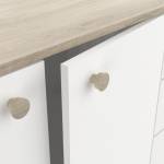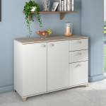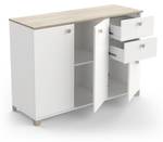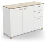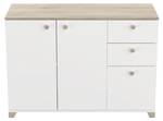 Entdecken Sie unser Sideboard mit 3 Türen und 2 Schubladen in Kronberger Eiche und Weiß - L119,6 cm. Seine zahlreichen Ablagen ermöglichen es Ihnen, die Dinge Ihrer Wahl aufzubewahren. Auf der oberen Ablage können Sie die Gegenstände und die Dekoration, die Sie wünschen, ausstellen. Sein Format ist sehr praktisch, da es die Bodenfläche kaum beansprucht, Ihnen aber eine zusätzliche Aufbewahrungsmöglichkeit bietet. Sein modernes Design passt zu jedem Einrichtungsstil. Produktmerkmale : Dekor Kronberger Eiche und Weiß. Aus 15 mm starken Spanplatten. 2 Schubladen (Nutzmaße: L 34,9 x T 33,7 x H 10,6cm): Tragkraft 2kg. 3 Türen. 1 innerer Fachboden, auf 3 Ebenen verstellbar (Nutzmaße: L 76,5 x T 39,5cm): Tragkraft 12kg. Griffe in Knopfform aus Kunststoff. Trapezförmiges Fußgestell aus Kunststoff. Gerade Kante 17 mm. Muss selbst zusammengebaut werden. Für den Hausgebrauch bestimmt. Abmessungen des Produktes :Länge 119,6 cm x Breite 41,9 cm x Höhe 85,1 cm - Nettogewicht: 37,95 kg. Abmessungen des Paketes : Paket Nr. 1: Länge 43,4 cm x Höhe 14 cm x Tiefe 127 cm - Bruttogewicht: 38,8 kg.