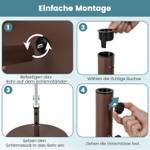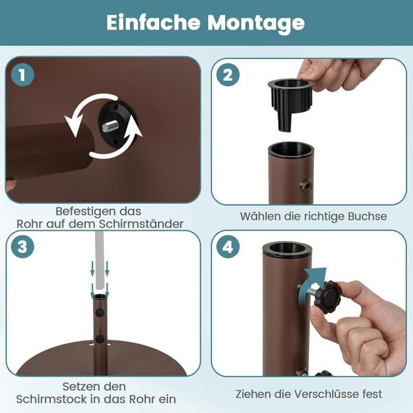 Klare Anweisungen machen die Montage sehr einfach. Sie müssen lediglich das Rohr am Ständer fixieren, den richtigen Adapter auswählen, dann die Sonnenschirmstange in das Rohr einführen und die Befestigungen anziehen, um zuverlässige Unterstützung für Ihren Sonnenschirm zu gewährleisten.