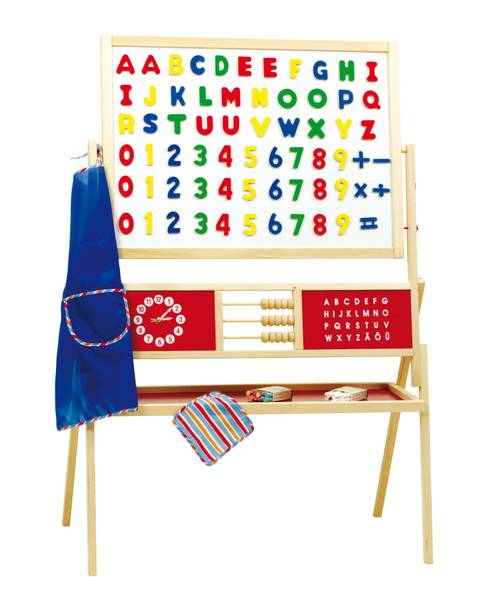 - Lieferumfang: 1x Standtafel drehbar aus Holz Natur / magnetisch / inkl. Schürze, Kreideset, 31 Magnetbuchstaben, 35 Magnetzahlen und eine Papierrolle von 5 Metern
