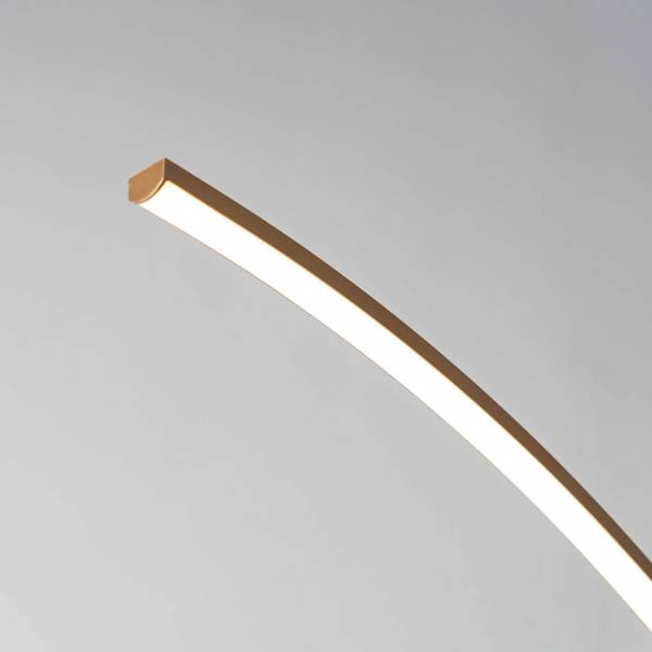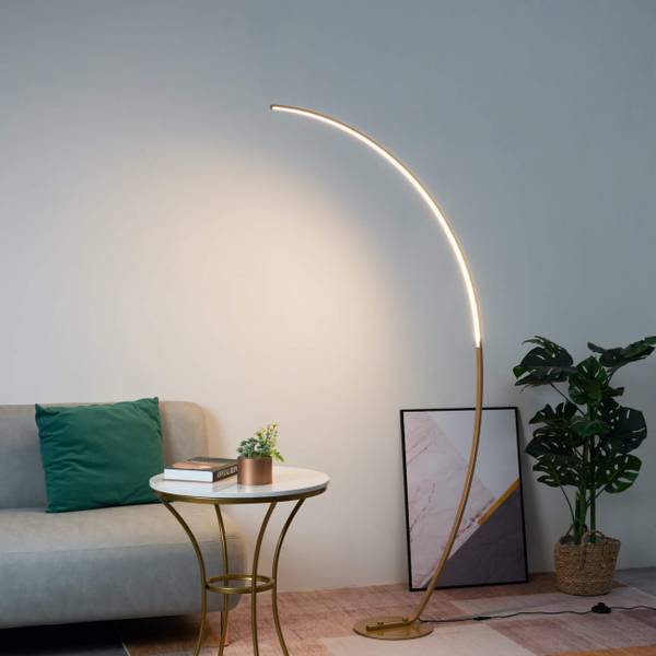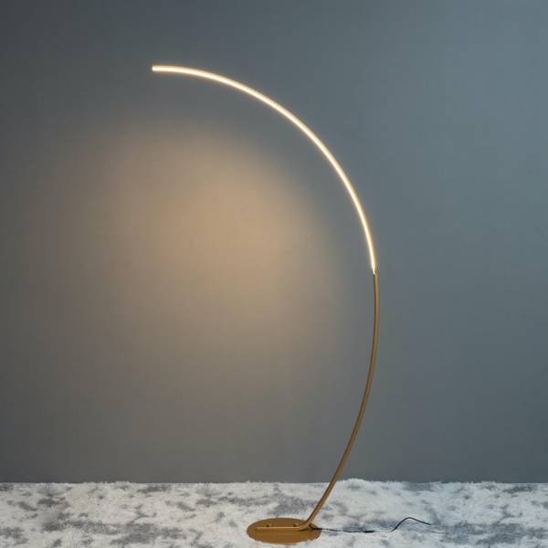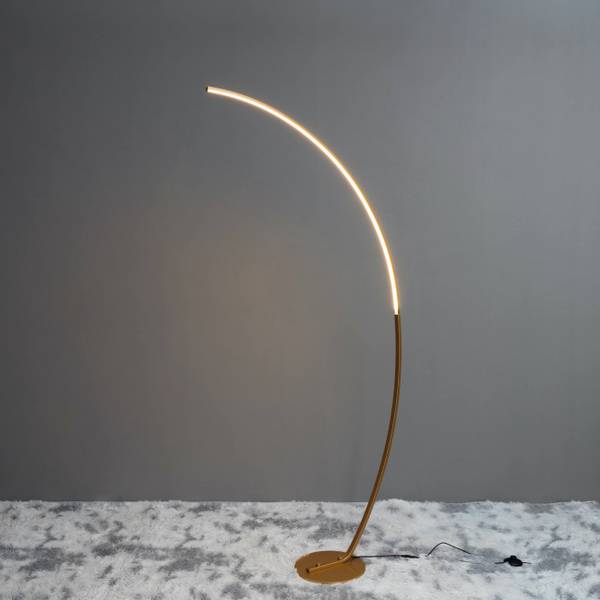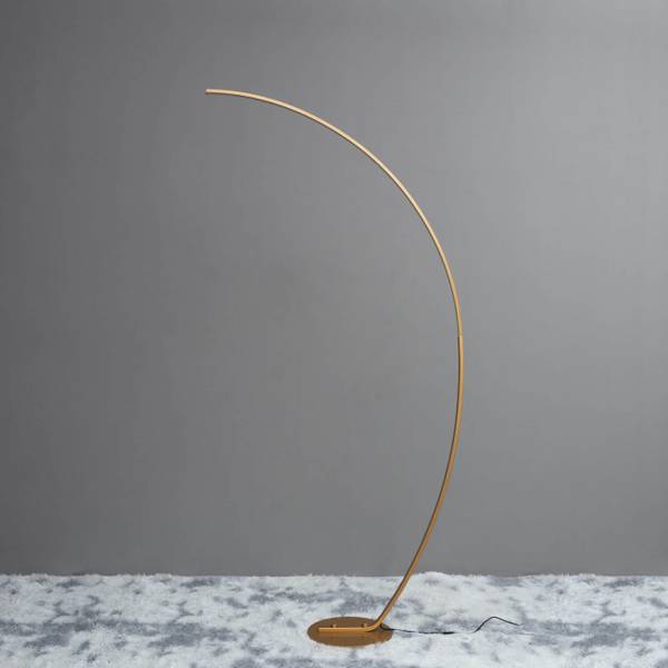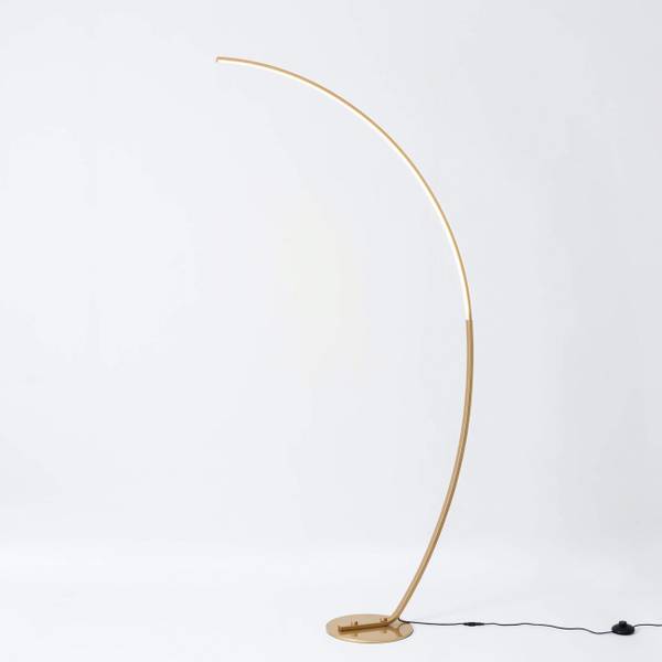 Thalia ist eine elegante, gebogene Stehleuchte in mattem Gold mit einer Höhe von 184 cm. Perfekt für ein Schlafzimmer oder Wohnzimmer, strahlt sie ein angenehmes warmweißes Licht (3000K) dank ihrer integrierten LEDs aus. Ihr schlichtes Design und hochwertige Materialien machen sie zu einem modernen und dezenten Stück, das sich harmonisch in jedes Interieur einfügt.