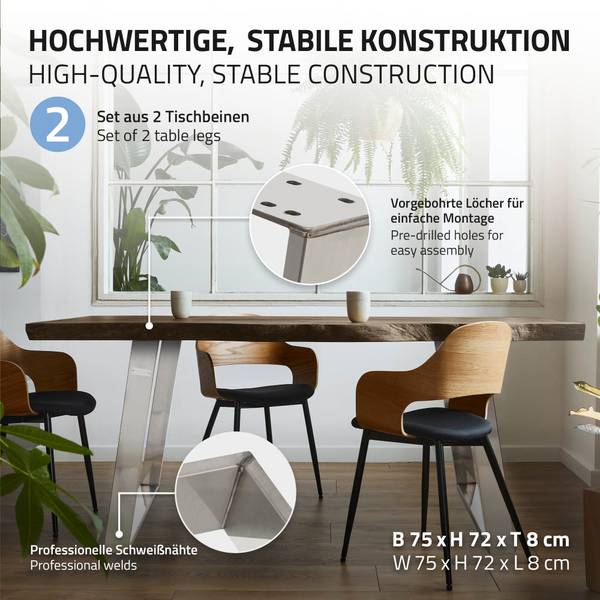 Mit diesen Tischbeinen von ML-Design erhält Dein Tisch einen industriellen Charakter. Die 80° Neigung sorgt für ein extravagantes Design und gewährleistet eine höhere Stabilität. Die stilvollen Tischbeine bzw. Esstischbeine sind hochwertig und Schweißnähten verarbeitet.