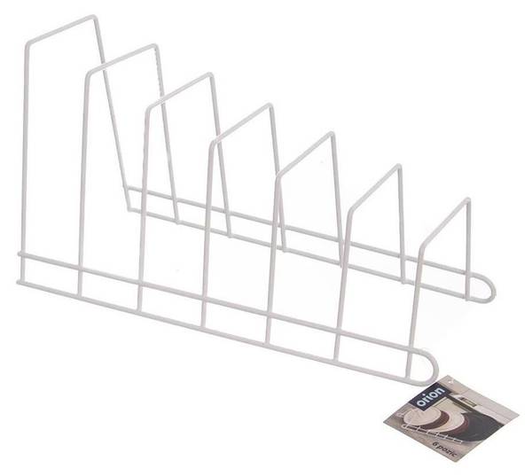 Ein Geschirrständer zur Aufbewahrung von sechs Topfdeckeln oder Tellern. Sie können ihn auf der Tischplatte aufbewahren oder in einen Schrank oder eine tiefe Schublade stellen. Dadurch werden sowohl Topfdeckel als auch Teller aufrecht gelagert. Der Ständer hilft, Unordnung in Schubladen zu vermeiden, die durch verstreute Deckel verursacht wird. Einfach zu reinigen. Das klassische Muster und die Farbe passen in jede Küche. Das Originalprodukt der tschechischen Marke Orion. Gemäß den europäischen Normen hergestellt.