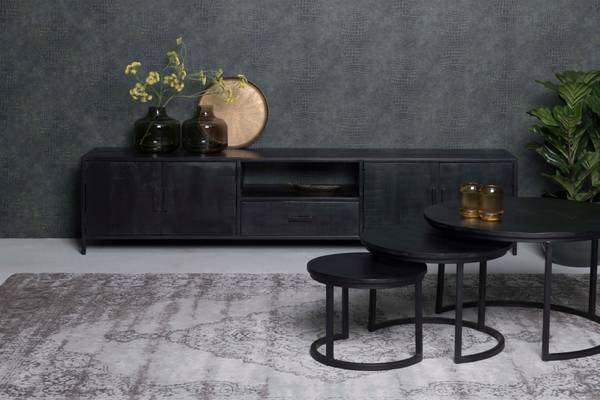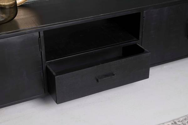 Die sorgfältig aufgetragene schwarze Lackierung schützt das Holz und hebt zugleich seine natürliche Struktur hervor – so wird jedes TV-Lowboard zu einem einzigartigen Blickfang. Mit seiner klaren Formensprache fügt sich das Möbelstück mühelos in moderne wie auch klassische Wohnkonzepte ein und bietet praktischen Stauraum für deine persönlichen Schätze.