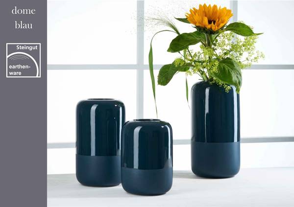 Pur, aber markant: Auf der minimalistischen Zylinderform der Dome Vasen präsentiert sich die Kombination aus seidenmatt glasiertem Sockel und glanzglasiertem oberen Teil als raffinierte gestalterische Komponente mit Wow-Effekt. Deshalb sind die Vasen - am besten gleich in mehreren Größen auf dem Tisch, dem Sideboard oder der Fensterbank arrangiert - sowohl mit phantasievoller Floristik wie auch als Solitärobjekte echte Highlights. Übrigens: Mit ihrer relativ kleinen Öffnung empfehlen sie sich insbesondere für weniger voluminöse Arrangements, die darin locker zusammengehalten werden und dabei ganz natürlich fallen können.