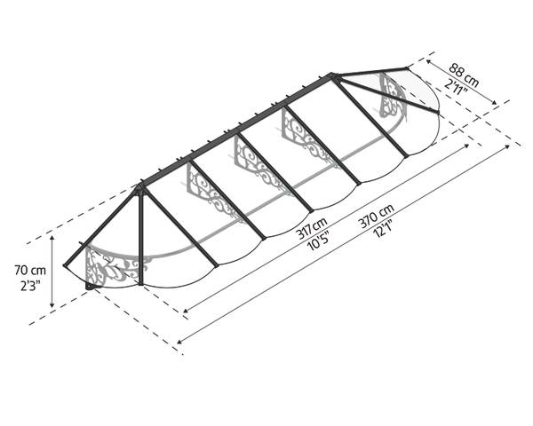 Canopia Lily Alu Vordach 88X370 cm Klares Verleihen Sie Ihrem Zuhause einen Hauch von Romantik mit dem Türvordach Canopia Lily von Palram. Lassen Sie sich nicht von den kunstvollen Details täuschen, dieses Türvordach wird mit rostfreien Aluminiumprofilen und pulverbeschichteten verzinkten Stahlhalterungen geliefert. Dieses Retro-Türvordach ist in verschiedenen Größen für unterschiedliche Verwendungszwecke erhältlich. Egal, ob Sie Ihr Fenster, Ihre Haustür oder Ihre Garage abdecken, die Lily-Vordächer machen immer einen beeindruckenden Anblick.