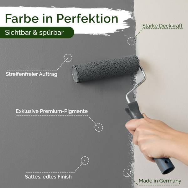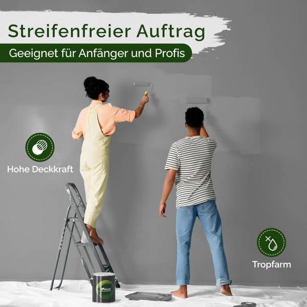Unsere Premiumfarbe überzeugt durch eine exzellente Deckkraft bereits beim ersten Anstrich. Dank der Verwendung hochkonzentrierter Premium-Pigmente entstehen gleichmäßige, brillante Farbergebnisse ohne Streifen oder Flecken. So erzielst du ein makelloses Finish mit minimalem Aufwand – effizient und materialsparend.
