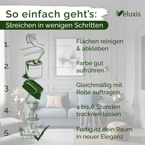Die Veluxis® Premium-Wandfarbe verleiht deinen Räumen eine hochwertige, matte Oberfläche mit besonders edlem Charakter. Das samtige Finish sorgt für ein modernes, stilvolles Ambiente und macht Wände zu echten Highlights. Ideal für anspruchsvolle Wohnräume, die Wert auf Design und Qualität legen.