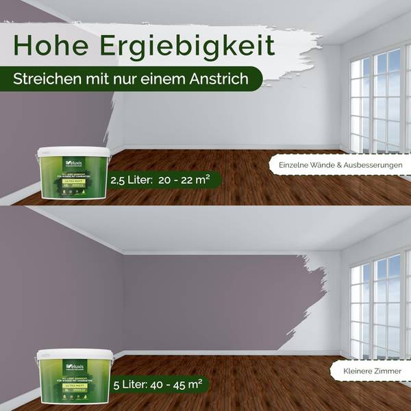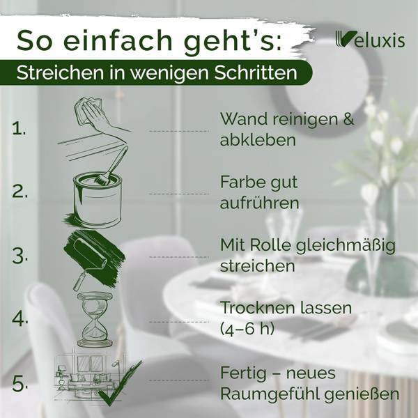 Dank der geschmeidigen Konsistenz lässt sich die Farbe leicht mit Pinsel oder Rolle auftragen. Selbst ohne Vorkenntnisse erzielst du ein gleichmäßiges, deckendes Ergebnis. Bereits beim ersten Anstrich überzeugt Veluxis® mit starker Deckkraft und einer satten, gleichmäßigen Farbwirkung. Ideal für DIY-Projekte, schnelle Renovierungen oder kreative Raumgestaltungen.