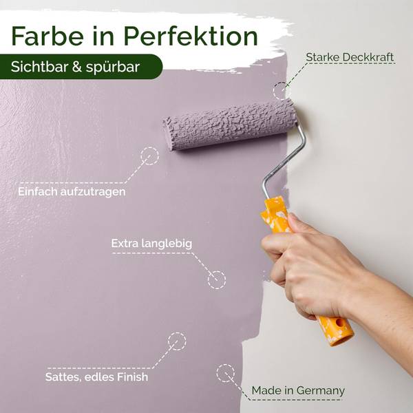 Unsere spezielle Formulierung reduziert Spritzer und Kleckse auf ein Minimum. Die Farbe ist tropfarm, schnell trocknend und nahezu geruchslos – perfekt für ein sauberes und angenehmes Streicherlebnis. Zudem ist sie frei von Lösungsmitteln, emissionsarm und besonders wohnfreundlich, auch für Kinderzimmer oder Allergiker geeignet.