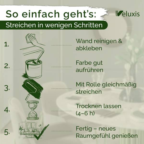 Dank der geschmeidigen Konsistenz lässt sich die Farbe leicht mit Pinsel oder Rolle auftragen. Selbst ohne Vorkenntnisse erzielst du ein gleichmäßiges, deckendes Ergebnis. Bereits beim ersten Anstrich überzeugt Veluxis® mit starker Deckkraft und einer satten, gleichmäßigen Farbwirkung. Ideal für DIY-Projekte, schnelle Renovierungen oder kreative Raumgestaltungen.