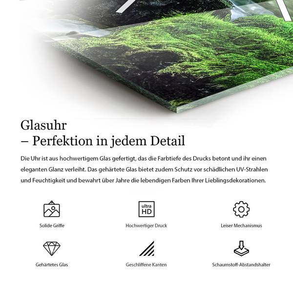 Verwandeln Sie Ihr Zuhause mit unseren exklusiven Glasuhren, die nicht nur die Zeit anzeigen, sondern auch ein stilvolles Statement in jedem Raum setzen. Jede unserer Uhren wird mit größter Sorgfalt aus hochwertigem 4 mm Floatglas gefertigt, einem Material, das für seine glatte Oberfläche, Transparenz und bemerkenswerte Stabilität bekannt ist. Diese Materialwahl garantiert nicht nur eine lange Lebensdauer, sondern auch eine brillante Wiedergabe der aufgedruckten Motive.