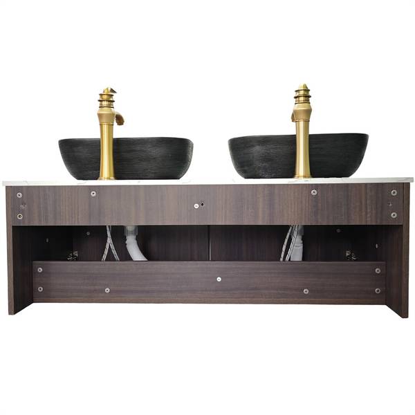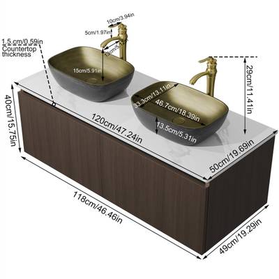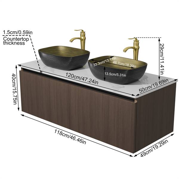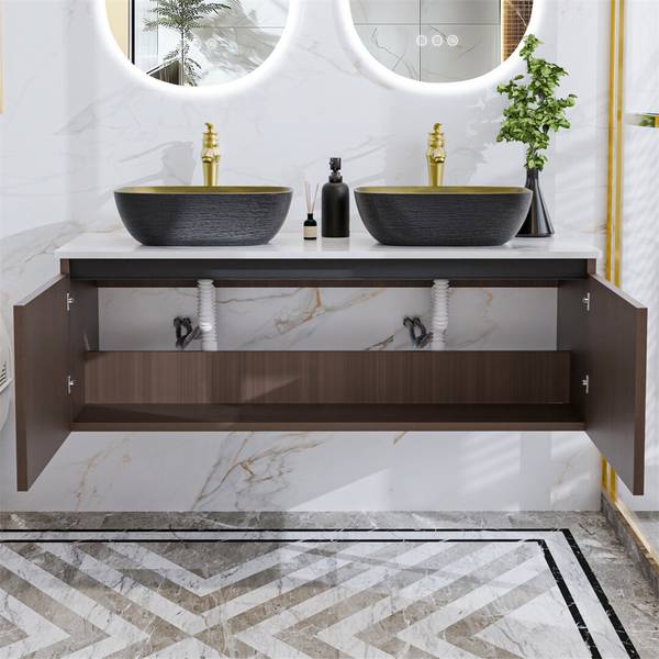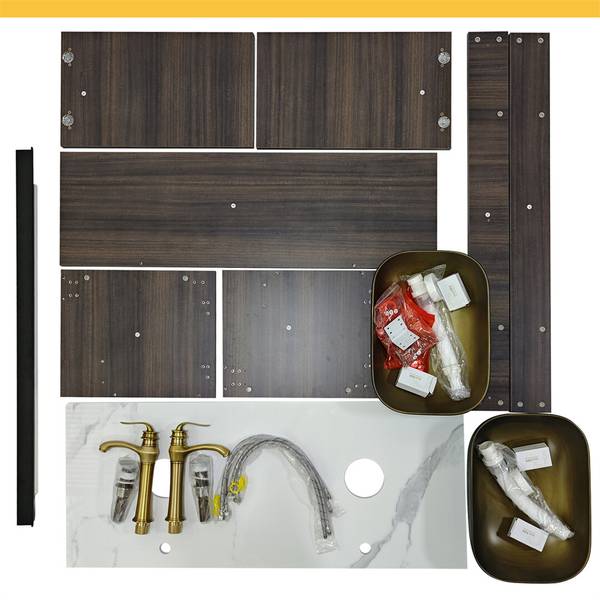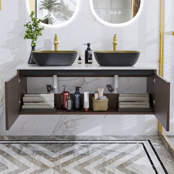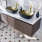Dieses Badmöbel-Set vereint alles, was ein modernes Bad braucht – ein edles Aufsatzwaschbecken, eine passende Armatur in Goldoptik, eine pflegeleichte Platte in Marmor-Optik und ein Unterschrank in edler Walnussfarbe. Alle Komponenten sind perfekt aufeinander abgestimmt – sofort einsatzbereit, ohne aufwendige Einzelkäufe.