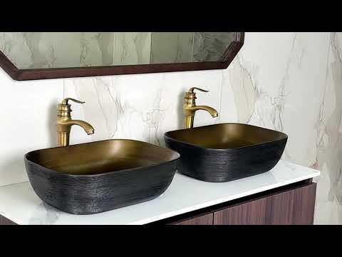 Das handgefertigte Becken aus robuster Keramik überzeugt durch seine edle Farbgebung und Langlebigkeit. Die massive Messing-Armatur mit gebürsteter Goldoptik unterstreicht das hochwertige Gesamtbild und bietet zuverlässige Funktion – Tag für Tag.
