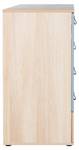Die Wickelkommode bietet dir viel Stauraum: Auf der linken Seite findest du eine Tür mit Türdämpfung, die ein leises Schließen garantiert. Dahinter verbergen sich zwei höhenverstellbare Einlegeböden – ideal für Windeln, Kleidung und Pflegeprodukte. Auf der rechten Seite erwarten dich ein offenes Fach sowie drei Schubkästen mit praktischer Self-Soft-Close-Funktion. So bleibt alles ordentlich verstaut und ist dennoch schnell griffbereit.