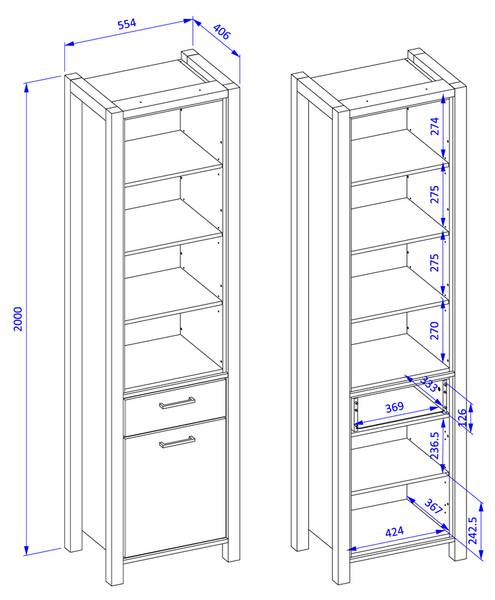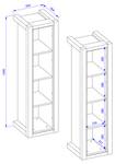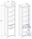 1x Bücherregal mit 1 Tür links/rechts montierbar, 1 Schublade mit Vollauszug, 4 feste Einlegeböden, 4 LED Profile, Gesamtmaß B/H/T: ca. 55/200/41 cm
