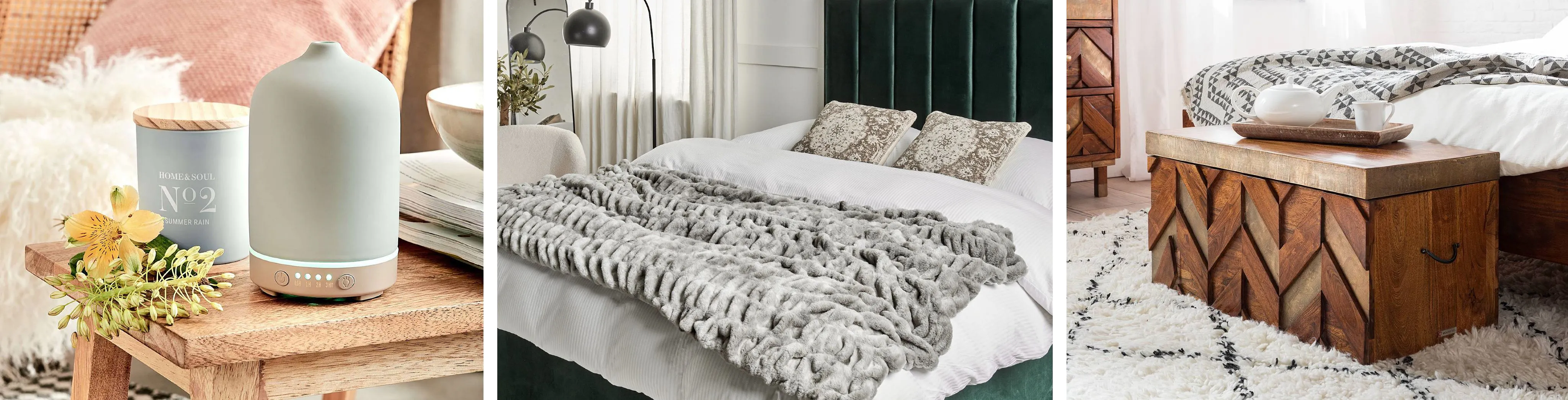 Apropos behagliche Stimmung: Auch Kerzen, ob echte Kerzen oder LED-Kerzen, sind im Schlafzimmer herzlich willkommen. Vielleicht möchtest du es mit einem Aroma-Diffuser probieren, der entspannende Düfte sanft durch dein Schlafzimmer verbreitet. Auch ein Pillow Spray, mit dem du dein Kopfkissen vor dem Schlafengehen besprühst, kann wahre Wunder wirken.