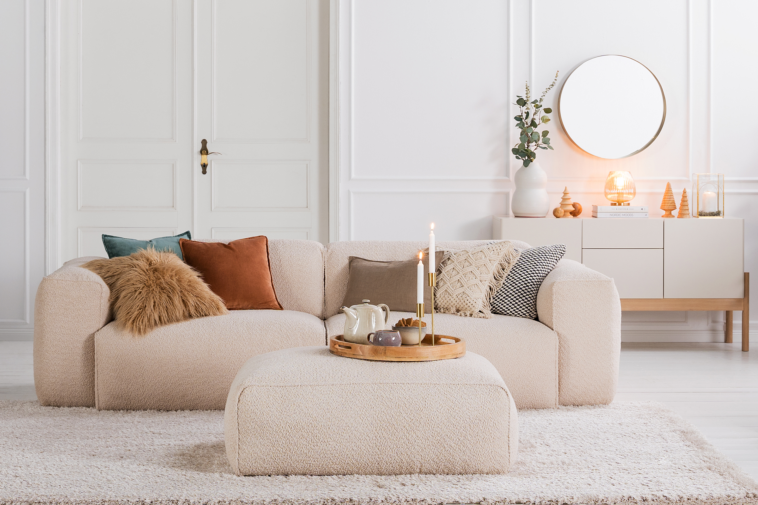Das großzügige Big-Sofa in Begleitung des curvy Couchtischs wird zum gemütlichen Lieblingsplatz für gesellige Glühwein- und Plätzchenabende. Die organischen Möbelformen fügen sich perfekt in das lebhafte Setting ein, während schwarze Komponenten einen edgy Kontrast in den Blick rücken.